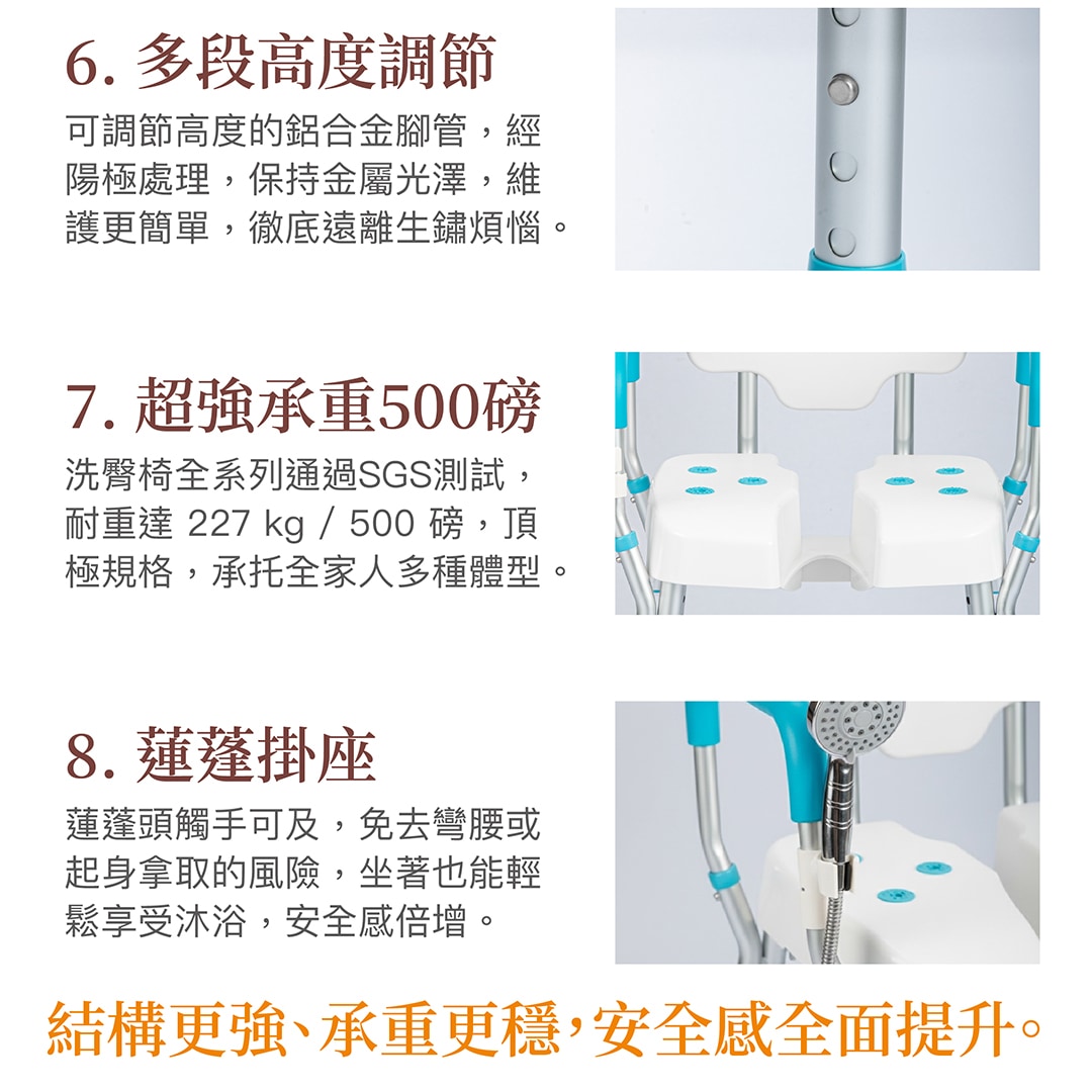 你好,洗臀系列洗澡椅可荷重至500磅 / 227公斤喔,坐墊的設計不影響它荷重的表現。提醒您,使用時切勿在座面上強力晃動及故意踩踏等不適方式,以確保您的安全。謝謝您的詢問 :)